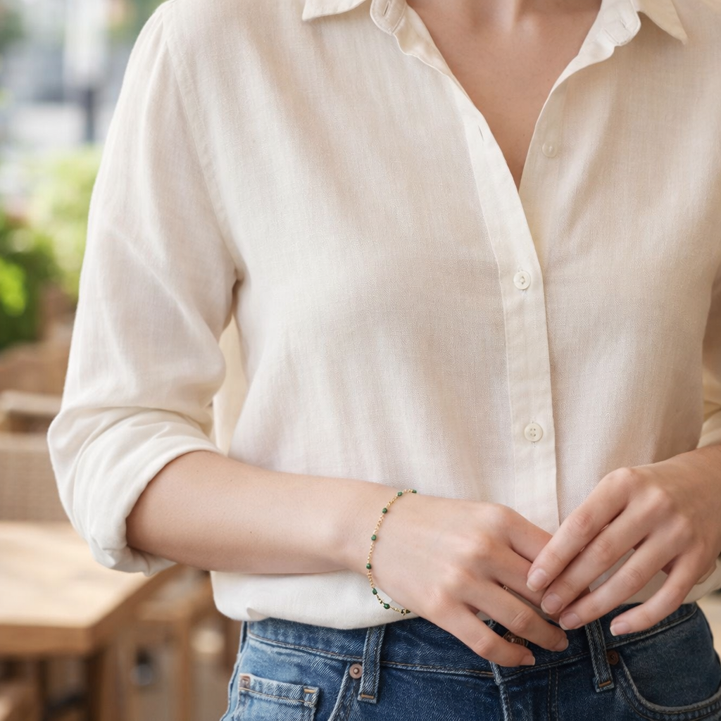 Laissez-vous envoûter par le charme irrésistible de ce bracelet fin doré. Orné de petites billes d'un vert profond et mystérieux, ce bijou apporte une note de caractère et d'élégance à votre poignet. Une couleur intemporelle qui se marie magnifiquement avec l'éclat de l'or.